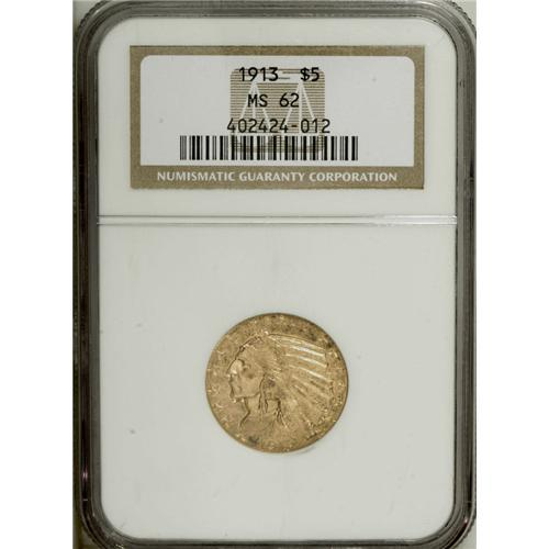 <B>1913 $5 MS62 NGC.</B></I> This lustrous representative has slightly above-average peripheral detail. A number of small abrasions affect the Indian's cheek and lip, and copper spots are noted in the obverse fields.<BR><BR><b>Shipping:</b> Coins & Currency (<a target="_blank" href="http://www.heritageauctions.com/common/shipping.php">view shipping information</a>)