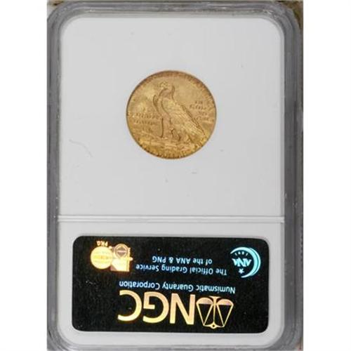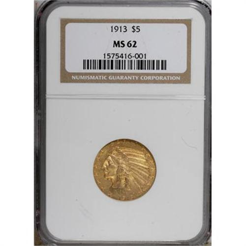 <B>1913 $5 MS62 NGC.</B></I> A frosty Mint State piece, both sides have dark patina on lustrous yellow surfaces. Not a particularly rare date through MS64, the 1913 is a rarity in Gem quality.<BR><BR><b>Shipping:</b> Coins & Currency (<a target="_blank" href="http://www.heritageauctions.com/common/shipping.php">view shipping information</a>)