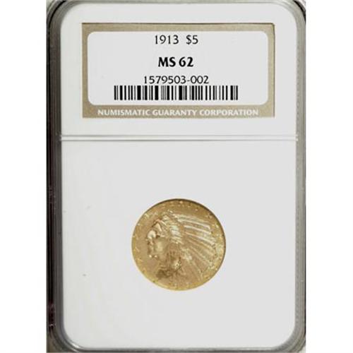 <B>1913 $5 MS62 NGC.</B></I> NGC Census: (2616/1138). PCGS Population (1978/1493). Mintage: 915,900. Numismedia Wsl. Price for NGC/PCGS coin in MS62: $1,075. (#8525)<BR><BR><B>Coin Engraver:</B> Bela Lyon Pratt<BR><BR><b>Shipping:</b> Coins & Currency (<a target="_blank" href="http://www.heritageauctions.com/common/shipping.php">view shipping information</a>)