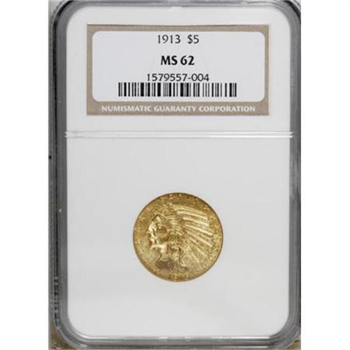 <B>1913 $5 MS62 NGC.</B></I> . NGC Census: (2639/1159). PCGS Population (2009/1508). Mintage: 915,900. Numismedia Wsl. Price for NGC/PCGS coin in MS62: $1,025. (#8525)<BR><BR><B>Coin Engraver:</B> Bela Lyon Pratt<BR><BR><b>Shipping:</b> Coins & Currency (<a target="_blank" href="http://www.heritageauctions.com/common/shipping.php">view shipping information</a>)