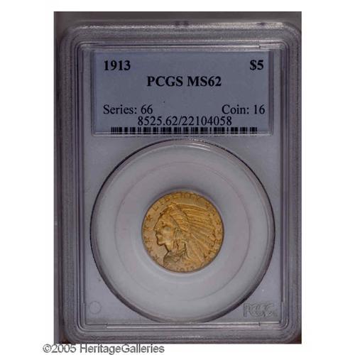 <B>1913<$5> MS62 PCGS.</B></I> Orange and olive colors alternate across this reasonably struck Indian Half Eagle, which has a clean obverse and a few light marks on the reverse field.
