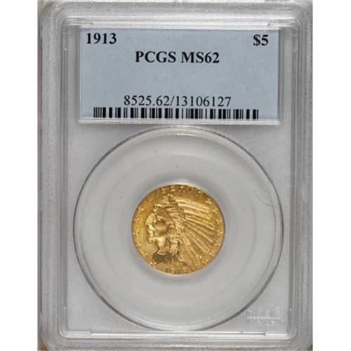 <B>1913 $5 MS62 PCGS.</B></I> The slightly flashy surfaces have vivid yellow-gold color tempered by orange accents. A solidly defined mid-date example with light, scattered abrasions that account for the grade.<BR><BR><b>Shipping:</b> Coins & Currency (<a target="_blank" href="http://www.heritageauctions.com/common/shipping.php">view shipping information</a>)