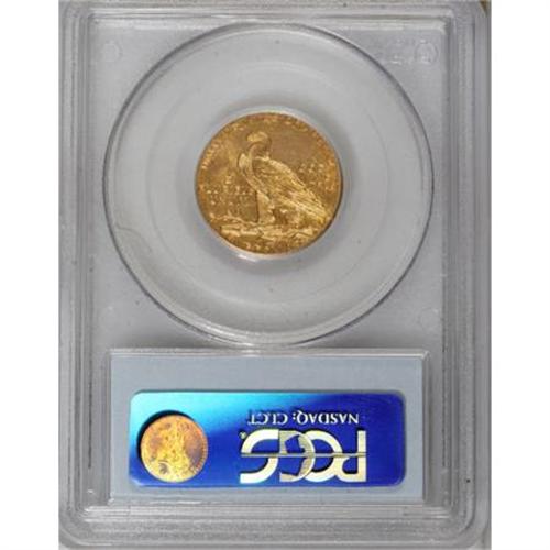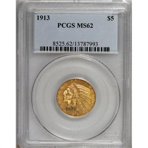 <B>1913 $5 MS62 PCGS.</B></I> The fields have a dusky orange appearance, while the centers have lighter yellow-gold color. This mid-date P-mint piece shows a number of shallow field abrasions that preclude a finer grade.<BR><BR><B>Coin Engraver:</B> Bela Lyon Pratt<BR><BR><b>Shipping:</b> Coins & Currency (<a target="_blank" href="http://www.heritageauctions.com/common/shipping.php">view shipping information</a>)