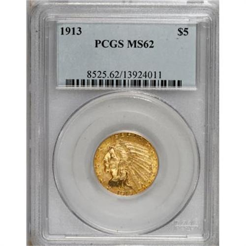 <B>1913 $5 MS62 PCGS.</B></I> PCGS Population (1936/1472). NGC Census: (2547/1085). Mintage: 915,900. Numismedia Wsl. Price for NGC/PCGS coin in MS62: $1,175. (#8525)<BR><BR><B>Coin Engraver:</B> Bela Lyon Pratt<BR><BR><b>Shipping:</b> Coins & Currency (<a target="_blank" href="http://www.heritageauctions.com/common/shipping.php">view shipping information</a>)