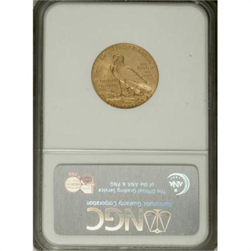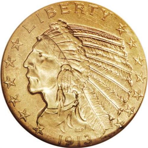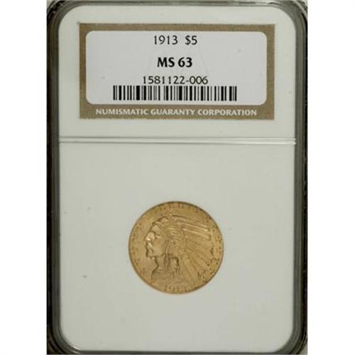 <B>1913 $5 MS63 NGC.</B></I> A gently shimmering green-gold type coin with a pleasantly sharp strike on the headdress and plumage. Unabraded save for minor contact near the profile. The initials of Bela Lyon Pratt are prominent above the date, but he avoided the criticism Victor D. Brenner faced for a less conspicuous placement on the cent's reverse exergue.<BR><BR><B>Coin Engraver:</B> Bela Lyon Pratt<BR><BR><b>Shipping:</b> Coins & Currency (<a target="_blank" href="http://www.heritageauctions.com/common/shipping.php">view shipping information</a>)