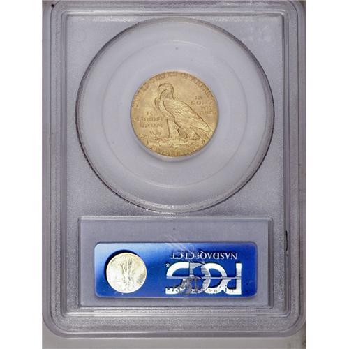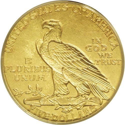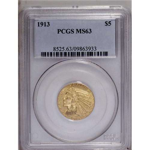 <B>1913<$5> MS63 PCGS.</B></I> The 1913 is one of the most common dates of the Indian Head five dollar series. Specimens are readily available in all grades short of near-Gem. The MS63 example offered in the current lot displays decent luster and peach-gold patina imbued with subtle traces of light green. The design features are well executed, with no areas revealing significant weakness. Minute contact marks are seen on the Indian's cheek, in the left (facing) obverse field, and in the upper right (facing) reverse fields. Generally, a pleasing coin for the grade designation.
