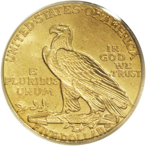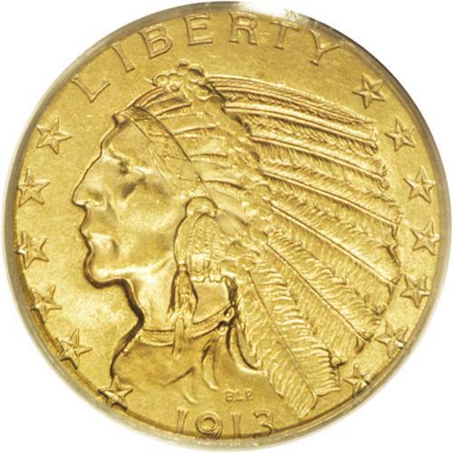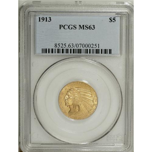 <B>1913 $5 MS63 PCGS.</B></I> This remarkable example has honey-gold color over both sides with fully brilliant satin luster. The design elements are fully detailed with no evidence of weakness on either side. Although this date is available in all grades through MS65, two MS60 grades are the finest of 19 pieces held by the Smithsonian Institution.<BR><BR><b>Shipping:</b> Coin/Currency (<a target="_blank" href="http://www.heritageauctions.com/common/shipping.php">view shipping information</a>)