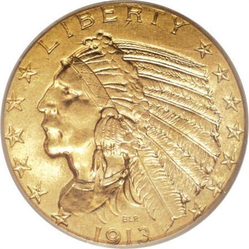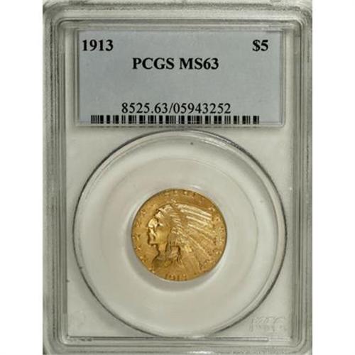 <B>1913 $5 MS63 PCGS.</B></I> This lovely Indian half eagle has rich orange toning and unencumbered cartwheel sheen. The strike is precise throughout, and the smooth surfaces display no marks remotely worthy of discussion. Mint State gold type has lagged the market since the introduction of the Buffalo gold bullion coin, but the underlying demand for classic Indian gold designs remains strong.<BR><BR><b>Shipping:</b> Coins & Currency (<a target="_blank" href="http://www.heritageauctions.com/common/shipping.php">view shipping information</a>)
