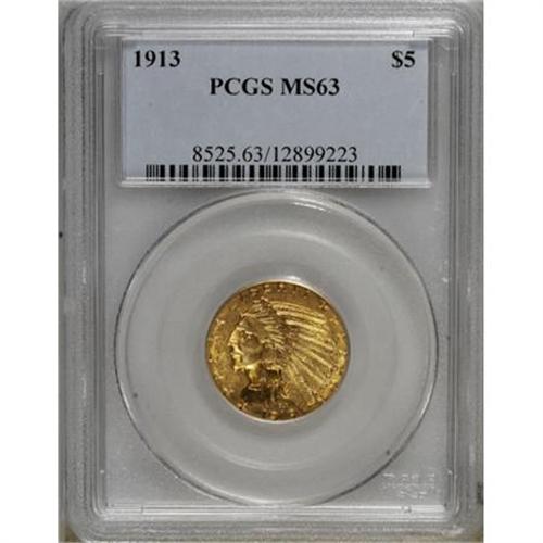 <B>1913 $5 MS63 PCGS.</B></I> Yellow-gold centers cede to orange-gold at the strongly lustrous margins. Few marks for the Select grade with excellent visual appeal. A great choice for the type enthusiast.<BR><BR><B>Coin Engraver:</B> Bela Lyon Pratt<BR><BR><b>Shipping:</b> Coins & Currency (<a target="_blank" href="http://www.heritageauctions.com/common/shipping.php">view shipping information</a>)