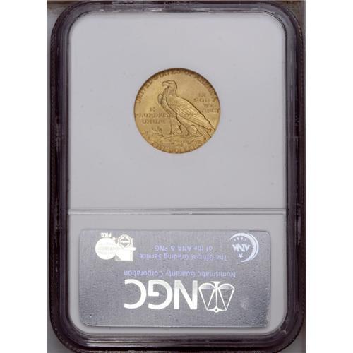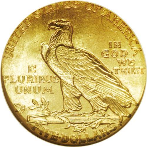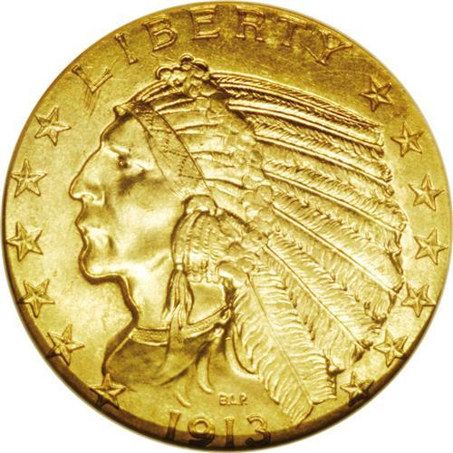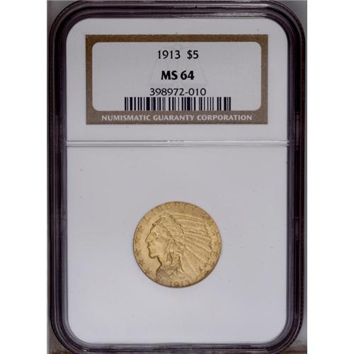 <B>1913 $5 MS64 NGC.</B></I> A choice Mint State example characterized by sharp design details and brilliant yellow-gold luster. A few minor abrasions keep it from Gem quality. Although this is a common date, from a mintage of nearly 1 million coins, few can be found any finer. NGC has only certified 36 better quality examples of the date (1/06).