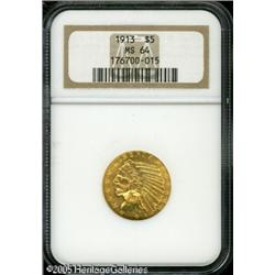 <B>1913 $5 MS64 NGC.</B></I> Highly lustrous and possessing an excellent strike, with a few paper-thin blemishes in the reverse fields. An ideal Choice Uncirculated representative of the type. Lot:8701