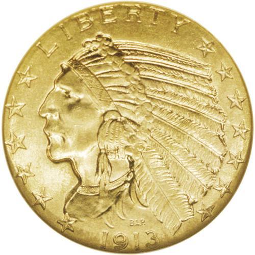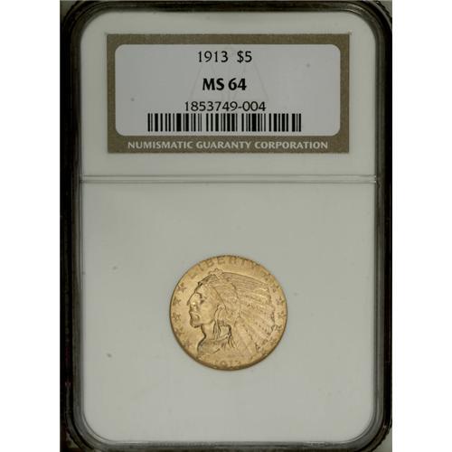 <B>1913 $5 MS64 NGC.</B></I> Robustly struck with unusually crisp detail on the peripheral devices. The yellow-orange fields have strong luster, and only a handful of light marks preclude a Gem grade. An interesting historical footnote is the story of the model for the obverse, a Blackfoot, Chief Thundercloud. His interesting life included military service and modeling for several artists, one of whom he married in 1896.<BR><BR><b>Shipping:</b> Coin/Currency (<a target="_blank" href="http://www.heritageauctions.com/common/shipping.php">view shipping information</a>)