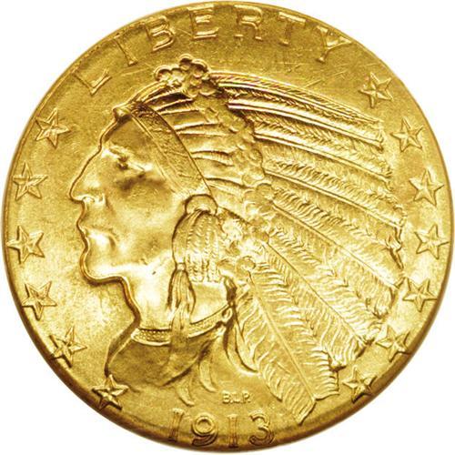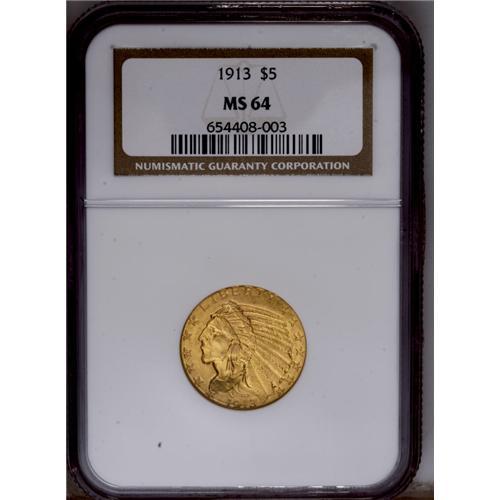 <B>1913<$5> MS64 NGC.</B></I> This example is seemingly near to a higher grade, blessed with a strong strike, lustrous straw-gold surfaces, and an absence of all but the most trivial abrasions on the obverse. This issue, along with a few others in the series with comparatively generous mintages, is a popular choice for a type set. NGC has graded 37 pieces finer (3/06). <BR><BR><B>Important notice:</B> Heritage usually auctions material at the rate of 200-250 lots per hour. On some occasions eBay Live bid software or the Internet may not be able to keep up with the pace of the auction. We recommend placing a realistic absentee bid now as insurance to avoid disappointment. Occasionally the auctioneer may eliminate or reject an eBay Live bid, and the auctioneer may also reopen a lot after the close of the eBay live bidding (usually because we missed an audience bid), and may reject your bid even if it shows you as the winning bidder. By bidding via eBay Live, you agree that Heritage may award the lot to another bidder at its sole discretion under the circumstances described above or any other reasonable circumstances. Since eBay bids are not shown to us until we open the lot on the floor, we treat those bids just like floor bids. In most cases the floor responds before the eBay bid is presented to us, due to Internet lag time, so for consistency we have made it a policy that floor bids are always considered first over tie eBay live bids. Also please note that all Heritage lots purchased through eBay Live carry a 20% Buyer's Premium. Please make sure you read the Terms and Conditions before you bid. This lot is being auctioned in conjunction with a live floor auction by Heritage Galleries & Auctioneers. All final auction and invoice information will be supplied by Heritage Galleries & Auctioneers, and all other information should be considered preliminary. Lot:2894 <BR><BR><B>Winning Notification and Billing:</B> After the FINAL session in this auction is complete, Heritage will send e-mail and snail mail invoices. This process normally takes several days. All final auction and invoice information will be supplied by Heritage Galleries & Auctioneers, and all other information should be considered preliminary. <BR><BR>This auction will be conducted on a live auction floor and over the Internet through eBay Live. If you choose to place an absentee bid, please take a moment to <font color='#0000ff'><u><a href='http://pages.ebay.com/liveauctions/help/before/laabsentee.html'>learn how eBay Live absentee bidding works</a></u></font><font color='#000000'>