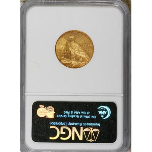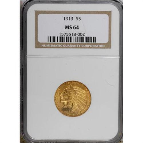 <B>1913 $5 MS64 NGC.</B></I> The 1913 is a readily obtainable date right through the near-Gem grade classification, before a sharp drop occurs at the MS65 level. Pleasing luster embraces both sides of this MS64 specimen, each of which is enriched with apricot-gold patination. The design elements are well impressed, including the Indian's headdress and the eagle's plumage. Some minute marks define the grade.<BR><BR><B>Coin Engraver:</B> Bela Lyon Pratt<BR><BR><b>Shipping:</b> Coins & Currency (<a target="_blank" href="http://www.heritageauctions.com/common/shipping.php">view shipping information</a>\)