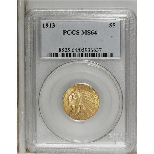<B>1913 $5 MS64 PCGS.</B></I> An obtainable issue with good production characteristics, the 1913 is well suited for type set purposes. This piece offers a good strike and handsome luster over surfaces that are predominantly khaki-gold. The certified populations thin out considerably at the next grade level.<BR><BR><b>Shipping:</b> Coins & Currency (<a target="_blank" href="http://www.heritageauctions.com/common/shipping.php">view shipping information</a>)