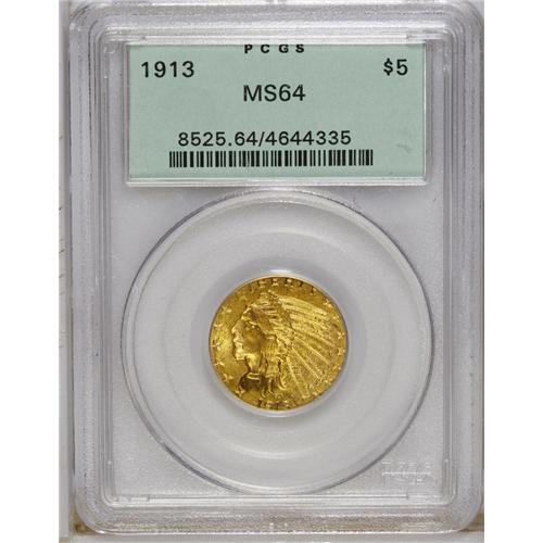<B>1913 $5 MS64 PCGS.</B></I> As one of the more obtainable P-mints in the series, the 1913 is generally available in mint condition. This also makes it one of the more attractive coins for type purposes. This particular piece would certainly be a worthy candidate. The surfaces are brightly frosted and each side is covered with a layer of rich reddish patina. Exceptional eye appeal and solidly graded.<BR><BR><b>Shipping:</b> Coin/Currency (<a target="_blank" href="http://www.heritageauctions.com/common/shipping.php">view shipping information</a>)