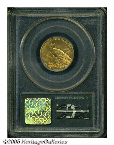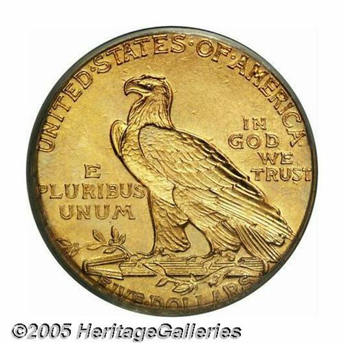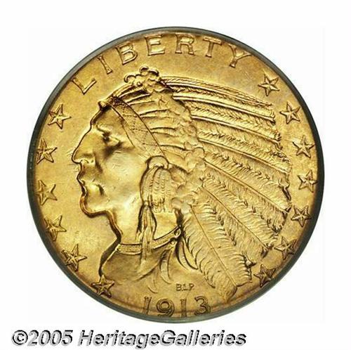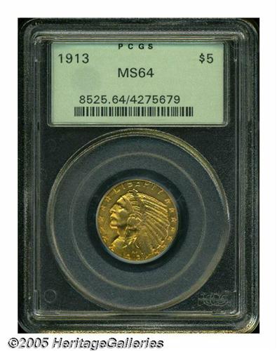 <B>1913<$5> MS64 PCGS.</B></I> This is a splendid example with satiny yellow-gold luster and sharp design features. Although not a particularly rare date, this issue is seldom found any nicer. An ideal coin for the date or type collector.