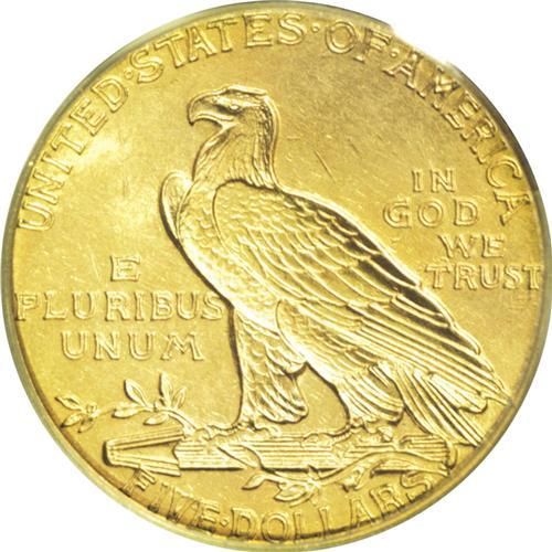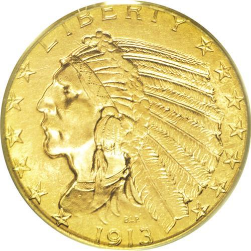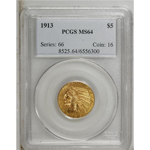 <B>1913<$5> MS64 PCGS.</B></I> This shimmering orange-gold type coin has an above average strike and an absence of detrimental marks. The determined observer can locate a few faint abrasions once aided by a loupe. The 1913 has the largest production of any Philadelphia issue of the type, although it is roughly one-fourth the mintage of the 1909-D.