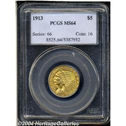 <B>1913<$5> MS64 PCGS.</B></I> A satiny near-Gem with a modest cartwheel sheen. The features are bold for the series and the often-seen striking incompleteness on the eagle's right (facing) wing and the Indian's headdress are conspicuous by their absence. This coin carries a high grade for this conditionally challenging Half Eagle type and should elicit well deserved bids.<BR><I>From The Greenwich Collection, Part One.</B></I> <BR><BR><B>Important notice:</B> Heritage usually auctions material at the rate of 200-250 lots per hour. On some occasions eBay Live bid software or the Internet may not be able to keep up with the pace of the auction. We recommend placing a realistic absentee bid now as insurance to avoid disappointment. Occasionally the auctioneer may eliminate or reject an eBay Live bid, and the auctioneer may also reopen a lot after the close of the eBay live bidding (usually because we missed an audience bid), and may reject your bid even if it shows you as the winning bidder. By bidding via eBay Live, you agree that Heritage may award the lot to another bidder at its sole discretion under the circumstances described above or any other reasonable circumstances. Since eBay bids are not shown to us until we open the lot on the floor, we treat those bids just like floor bids. In most cases the floor responds before the eBay bid is presented to us, due to Internet lag time, so for consistency we have made it a policy that floor bids are always considered first over tie eBay live bids. Also please note that all Heritage lots purchased through eBay Live carry a 20% Buyer's Premium. Please make sure you read the Terms and Conditions before you bid.