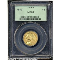 <B>1913<$5> MS64 PCGS.</B></I> A pleasing near-Gem that has rich golden and orange color. Boldly struck, as only a portion of the headdress feather closest to star 13 does not have crisp details. A single contact mark shows to the left of the eagle, otherwise a splendid near-Gem. A lovely coin that is excellent for type purposes.<BR><I>From The Greenwich Collection, Part One.</B></I> <BR><BR><B>Important notice:</B> Heritage usually auctions material at the rate of 200-250 lots per hour. On some occasions eBay Live bid software or the Internet may not be able to keep up with the pace of the auction. We recommend placing a realistic absentee bid now as insurance to avoid disappointment. Occasionally the auctioneer may eliminate or reject an eBay Live bid, and the auctioneer may also reopen a lot after the close of the eBay live bidding (usually because we missed an audience bid), and may reject your bid even if it shows you as the winning bidder. By bidding via eBay Live, you agree that Heritage may award the lot to another bidder at its sole discretion under the circumstances described above or any other reasonable circumstances. Since eBay bids are not shown to us until we open the lot on the floor, we treat those bids just like floor bids. In most cases the floor responds before the eBay bid is presented to us, due to Internet lag time, so for consistency we have made it a policy that floor bids are always considered first over tie eBay live bids. Also please note that all Heritage lots purchased through eBay Live carry a 20% Buyer's Premium. Please make sure you read the Terms and Conditions before you bid.