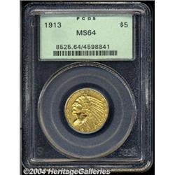 <B>1913<$5> MS64 PCGS.</B></I> An important issue among high quality type collectors, the 1913 Half Eagle is, nonetheless, a more difficult coin to find at the near-Gem level. This is an attractive coin whose primary strength is its minimally marked surfaces. Rich shades of yellow-gold color decorate the sharply struck features and confirm this coin's originality.<BR><I>From The Greenwich Collection, Part One.</B></I> <BR><BR><B>Important notice:</B> Heritage usually auctions material at the rate of 200-250 lots per hour. On some occasions eBay Live bid software or the Internet may not be able to keep up with the pace of the auction. We recommend placing a realistic absentee bid now as insurance to avoid disappointment. Occasionally the auctioneer may eliminate or reject an eBay Live bid, and the auctioneer may also reopen a lot after the close of the eBay live bidding (usually because we missed an audience bid), and may reject your bid even if it shows you as the winning bidder. By bidding via eBay Live, you agree that Heritage may award the lot to another bidder at its sole discretion under the circumstances described above or any other reasonable circumstances. Since eBay bids are not shown to us until we open the lot on the floor, we treat those bids just like floor bids. In most cases the floor responds before the eBay bid is presented to us, due to Internet lag time, so for consistency we have made it a policy that floor bids are always considered first over tie eBay live bids. Also please note that all Heritage lots purchased through eBay Live carry a 20% Buyer's Premium. Please make sure you read the Terms and Conditions before you bid.