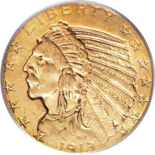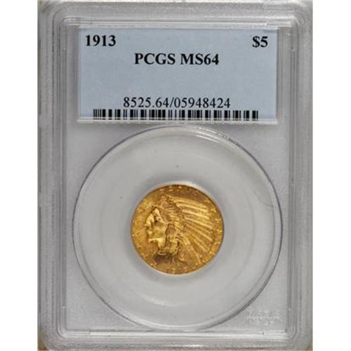 <B>1913 $5 MS64 PCGS.</B></I> The 1913 Indian Head half eagle, like most Philadelphia Mint issues, is usually found with a good strike and eye-appealing luster (Jeff Garrett and Ron Guth, 2006). The near-Gem in this lot is no exception, as the design elements stand out, and attractive apricot-gold luster exudes from both sides. A handful of minuscule handling marks define the grade.<BR><BR><b>Shipping:</b> Coins & Currency (<a target="_blank" href="http://www.heritageauctions.com/common/shipping.php">view shipping information</a>)