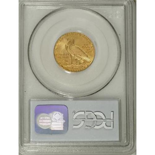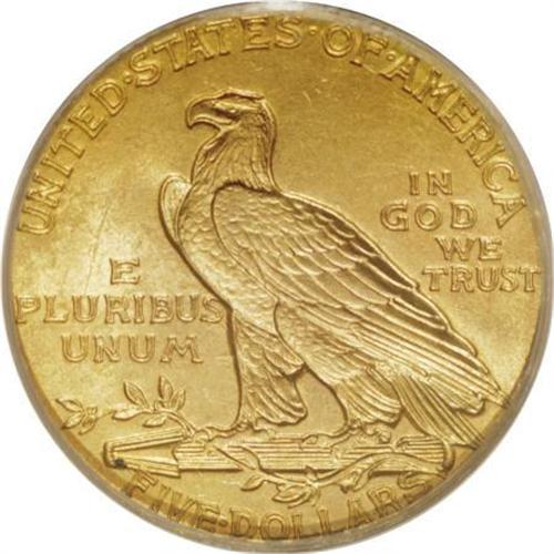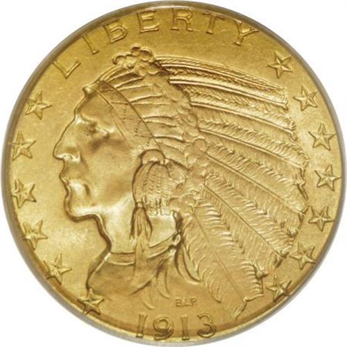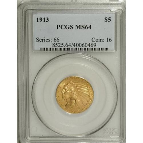 <B>1913 $5 MS64 PCGS.</B></I> While the major services have certified several hundred examples of this date in Choice condition, Gem specimens thin out by an order of magnitude, although still somewhat available for a (much higher) price. The present near-Gem accordingly strikes a pleasing balance between condition and cost. The plus sign in the equation, however, is that it also appears high-end for the grade, with pleasing orange-gold coloration and a bold strike, seemingly barred from the Gem ranks only by a single tick on the Indian's cheek. PCGS has certified 49 pieces finer (6/07).<BR><BR><b>Shipping:</b> Coins & Currency (<a target="_blank" href="http://www.heritageauctions.com/common/shipping.php">view shipping information</a>)