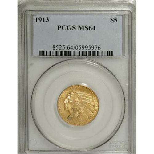 <B>1913 $5 MS64 PCGS.</B></I> One of the more available Indian Head half eagle issues, the 1913 is a frequent choice for the type collector. This elegant near-Gem would be a good match for a similarly graded set. The lemon-gold surfaces have unusually strong luster, and the devices exhibit uncommonly bold definition. An attractive piece that has above-average surface quality for the grade.<BR><BR><B>Coin Engraver:</B> Bela Lyon Pratt<BR><BR><b>Shipping:</b> Coins & Currency (<a target="_blank" href="http://www.heritageauctions.com/common/shipping.php">view shipping information</a>\)