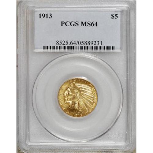 <B>1913 $5 MS64 PCGS.</B></I> This is a simply beautiful near-Gem of this available half eagle issue, as most coins of this date are well struck and eye-appealing. The rich, mellow surfaces boast much more luster than usual, with deep brownish-orange coloration. Aside from a single tick on the Indian's eyebrow, there are few abrasions of any size noted, even under a loupe. A superb type coin!<BR><BR><B>Coin Engraver:</B> Bela Lyon Pratt<BR><BR><b>Shipping:</b> Coins & Currency (<a target="_blank" href="http://www.heritageauctions.com/common/shipping.php">view shipping information</a>)