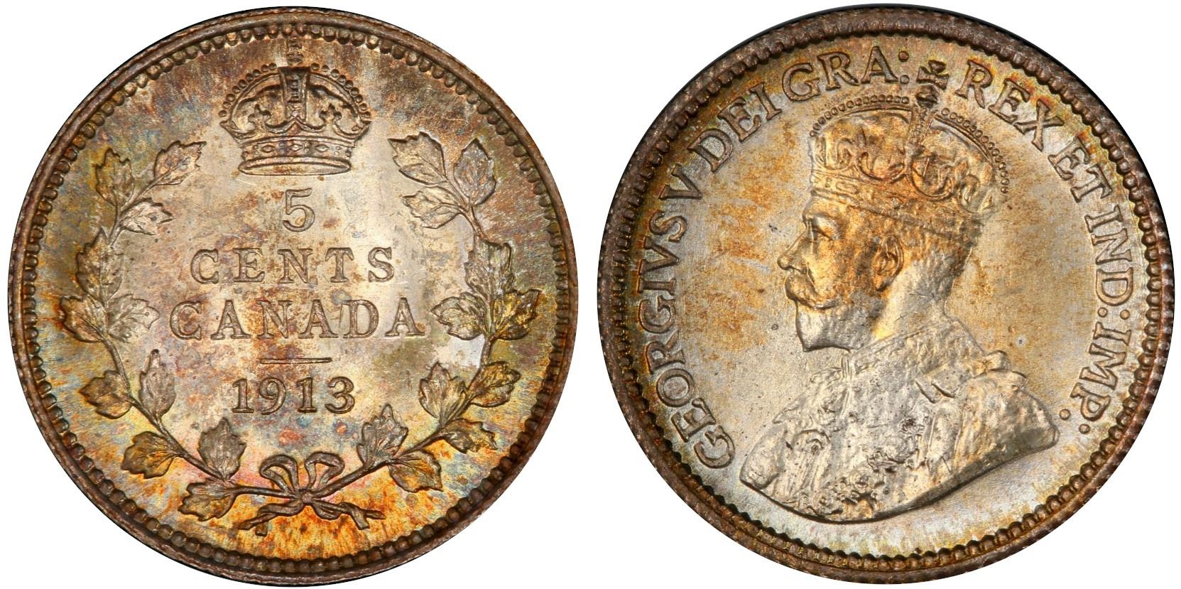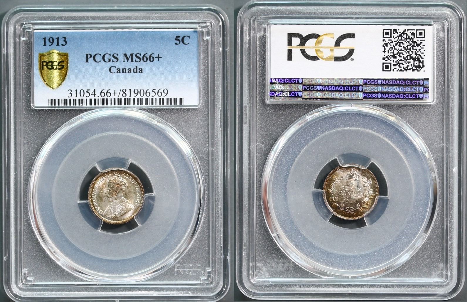 1913 5¢ PCGS Superb Gem Mint State-66+. An appealing gem example with an attractive mixture of more intenseand spotty yellow and gold tints.