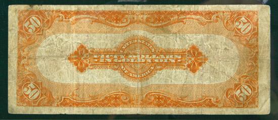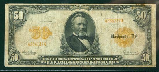 1913, $50 Gold Certificate. PCGS Apparent Fine 12. . Fr-1198. Small edge tears and stains gave PCGS Currency reasons to give this Gold $50 an "Apparent" grade.