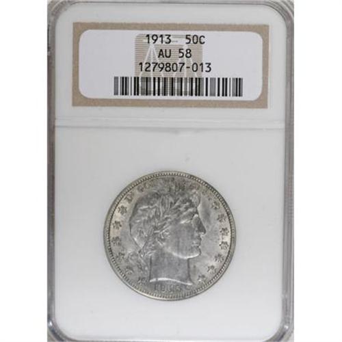<B>1913 50C AU58 NGC.</B></I> A lovely near-Mint representative of this low-mintage Philadelphia issue, one of just 188,000 pieces struck. The surfaces are softly lustrous beneath lovely sea-green and violet patina. Small, wispy abrasions and a touch of highpoint friction are noted on the well struck devices. Census: 10 in 58, 47 finer (10/07).<BR><BR><B>Coin Engraver:</B> Charles E. Barber<BR><BR><b>Shipping:</b> Coins & Currency (<a target="_blank" href="http://www.heritageauctions.com/common/shipping.php">view shipping information</a>)