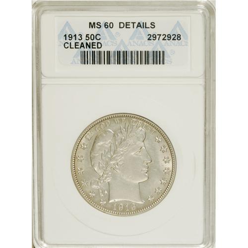 <B>1913 50C --Cleaned--ANACS. MS60 Details.</B></I> The 1913 has an unusually low mintage of 188,000 pieces, and ranks among the best Philadelphia issues within the series. The present piece is boldly struck and lacks visible wear, but the slate-gray surfaces are subdued.<BR><BR><b>Shipping:</b> Coins & Currency (<a target="_blank" href="http://www.heritageauctions.com/common/shipping.php">view shipping information</a>)