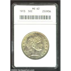 1913 50C MS62 ANACS. Dusky silver-gray color. A few faint slide marks below Liberty's chin and a typical strike, but with good luster. A small planchet flaw (as struck) rests between the final two obverse stars. Just 188,000 pieces were struck, which is less than the far more famous 1916-D Dime.From the Ohio Collection. Important notice: We expect to be auctioning lots at the rate of 200-250 per hour. Sometimes eBay Premier live bid software cannot keep up with that pace, so we strongly recommend that you place a realistic proxy bid now as insurance to avoid disappointment. Also please note that all Heritage/CAA lots purchased through eBay Premier carry a 20% Buyer's Premium. Please make sure you read the Terms and Conditions.