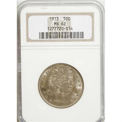 <B>1913 50C MS62 NGC.</B></I> Satiny luster shimmers beneath a veil of gray, gold, and light rose color. There are scattered marks, but no one mark is singularly offensive. The low mintage of 188,000 makes this issue a favorite among collectors.<BR><BR><B>Coin Engraver:</B> Charles E. Barber<BR><BR><b>Shipping:</b> Coins & Currency (<a target="_blank" href="http://www.heritageauctions.com/common/shipping.php">view shipping information</a>)