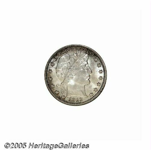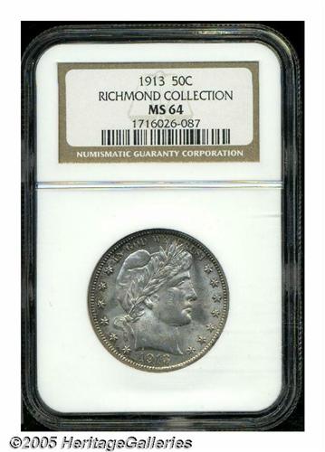 <B>1913<50C> MS64 NGC.</B></I> Ex: Richmond Collection. This issue boasts one of the lowest mintages (188,000 business strikes) among regular issue 20th century silver and minor coins. Understandably scarce at the present level, both sides of this lightly toned example exhibit frosty, highly lustrous surfaces. The strike is slightly weak on the reverse and there are just a few small surface disruptions on the obverse that serve to limit the grade. Population: 14 in 64, 9 finer (6/05).