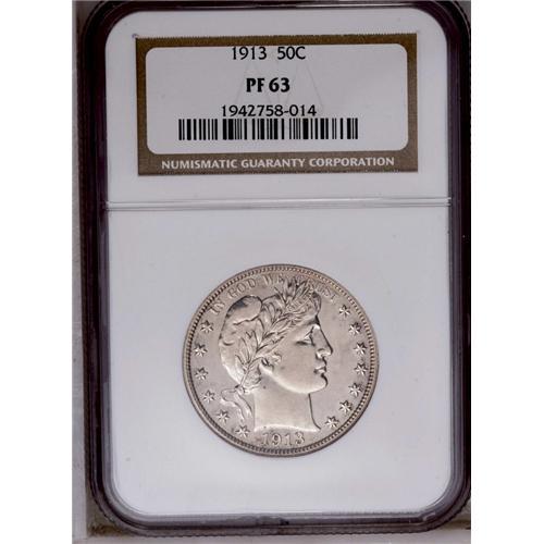 <B>1913<50C> PR63 NGC.</B></I> Glossy silver sheen on both sides with a hint of lilac overlay. Typically struck, and with a few tiny dark spots noted under a loupe. <BR><BR><B>Important notice:</B> Heritage usually auctions material at the rate of 200-250 lots per hour. On some occasions eBay Live bid software or the Internet may not be able to keep up with the pace of the auction. We recommend placing a realistic absentee bid now as insurance to avoid disappointment. Occasionally the auctioneer may eliminate or reject an eBay Live bid, and the auctioneer may also reopen a lot after the close of the eBay live bidding (usually because we missed an audience bid), and may reject your bid even if it shows you as the winning bidder. By bidding via eBay Live, you agree that Heritage may award the lot to another bidder at its sole discretion under the circumstances described above or any other reasonable circumstances. Since eBay bids are not shown to us until we open the lot on the floor, we treat those bids just like floor bids. In most cases the floor responds before the eBay bid is presented to us, due to Internet lag time, so for consistency we have made it a policy that floor bids are always considered first over tie eBay live bids. Also please note that all Heritage lots purchased through eBay Live carry a 20% Buyer's Premium. Please make sure you read the Terms and Conditions before you bid. This lot is being auctioned in conjunction with a live floor auction by Heritage Galleries & Auctioneers. All final auction and invoice information will be supplied by Heritage Galleries & Auctioneers, and all other information should be considered preliminary. Lot:2097 <BR><BR><B>Winning Notification and Billing:</B> After the FINAL session in this auction is complete, Heritage will send e-mail and snail mail invoices. This process normally takes several days. All final auction and invoice information will be supplied by Heritage Galleries & Auctioneers, and all other information should be considered preliminary. <BR><BR>This auction will be conducted on a live auction floor and over the Internet through eBay Live. If you choose to place an absentee bid, please take a moment to <font color='#0000ff'><u><a href='http://pages.ebay.com/liveauctions/help/before/laabsentee.html'>learn how eBay Live absentee bidding works</a></u></font><font color='#000000'>