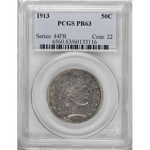 <B>1913 50C PR63 PCGS.</B></I> The obverse of this Select piece offers rich silver-blue and green-gold toning, while more translucent shadings grace the reverse. While the obverse mirrors are cloudy, the reverse fields are boldly reflective.<BR><BR><B>Coin Engraver:</B> Charles E. Barber<BR><BR><b>Shipping:</b> Coins & Currency (<a target="_blank" href="http://www.heritageauctions.com/common/shipping.php">view shipping information</a>)