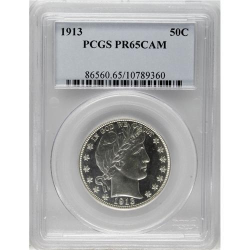 <B>1913 50C PR65 Cameo PCGS.</B></I> The Barber halves were the last examples of that denomination to have appreciable populations of Cameo examples until the middle to late dates of the Franklin series. This piece, which possesses a light champagne cast, has deeply reflective and well-preserved fields and lightly frosted devices. A few tiny grazes are noted on the portrait. Population: 2 in 65 Cameo, 3 finer (1/07).<BR><BR><b>Shipping:</b> Coins & Currency (<a target="_blank" href="http://www.heritageauctions.com/common/shipping.php">view shipping information</a>)