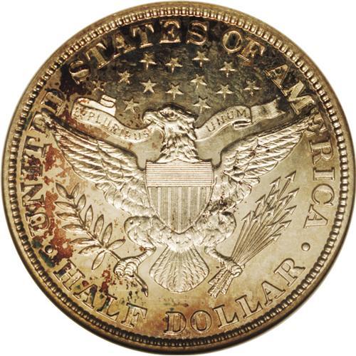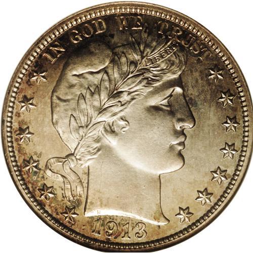 <B>1913<50C> PR65 NGC.</B></I> A remarkable and important Gem example with a hint of cameo contrast beneath lightly mottled iridescence. Both sides are extremely well struck with considerable eye appeal. It is an example that will please the advanced specialist. This is an important date considering the rarity of business strikes.