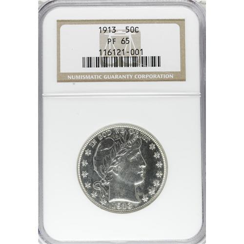 <B>1913 50C PR65 NGC.</B></I> The low business-strike mintage of this issue makes proofs of the date do double duty. This piece offers silvery fields with a touch of gold at the rims. A few trivial slide marks appear on Liberty's cheek and neck, far from distracting. Census: 26 in 65, 38 finer (4/07).<BR><BR><b>Shipping:</b> Coins & Currency (<a target="_blank" href="http://www.heritageauctions.com/common/shipping.php">view shipping information</a>)