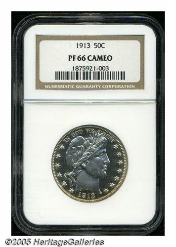 <B>1913<50C> PR66 Cameo NGC.</B></I> Proofs from this year (and the two that follow) enjoy added date pressure because of their low business strike production. In addition to being wonderfully preserved, this Premium Gem representative sports noticeable contrast between fields and devices. These qualities are most unusual for a 1913 proof Half Dollar. Population: 2 in 66 Cameo, 3 finer (6/05).