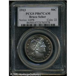 <B>1913 50C PR67 Cameo PCGS.</B></I> The 1913 half dollar has the second lowest overall mintage of any Philadelphia Mint issue with just 188,627 coins struck. Out of that total, 768 coins were Proofs. Survivors are plentiful in the lower Proof grades, but Superb Gem examples are quite rare. This amazing Cameo Proof is tied with one other as finest certified by PCGS. The obverse has light magenta and deep steel-blue color with a splash of white at upper obverse. The reverse is entirely brilliant, and the Cameo contrast is excellent. This is a lovely coin that is sure to please the date specialist or the type collector. Population: 2 in 67, 0 finer (1/05).<BR><I>From the Bruce Scher #1 All-Time PCGS Registry Set.</B></I> Lot:4129
