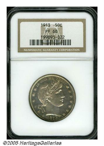 <B>1913<50C> PR68 NGC.</B></I> A supremely preserved specimen that offers a hint of contrast beneath splashes of milky gray and golden-russet toning. If one angles this piece ever-so-slightly under a light source, its outstanding attributes are more completely exposed. Exceptional quality from a mintage of just 627 proofs. Population: 2 in 68, 0 finer (6/05).