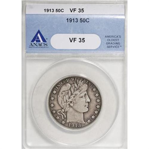 <B>1913 50C VF35 ANACS.</B></I> NGC Census: (0/70). PCGS Population (6/103). Mintage: 188,000. Numismedia Wsl. Price for NGC/PCGS coin in VF35: $359. (#6527)<BR><BR><B>Coin Engraver:</B> Charles E. Barber<BR><BR><b>Shipping:</b> Coins & Currency (<a target="_blank" href="http://www.heritageauctions.com/common/shipping.php">view shipping information</a>)