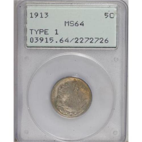 <B>1913 5C Type One MS64 PCGS.</B></I> PCGS Population (2970/4501). NGC Census: (1575/3344). Mintage: 30,993,520. Numismedia Wsl. Price for NGC/PCGS coin in MS64: $61. (#3915)<BR><BR><B>Coin Engraver:</B> James E. Fraser<BR><BR><b>Shipping:</b> Coins & Currency (<a target="_blank" href="http://www.heritageauctions.com/common/shipping.php">view shipping information</a>)