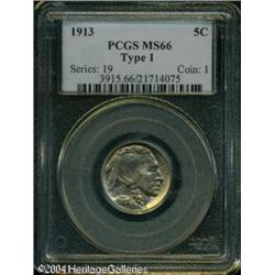 1913 5C Type One MS66 PCGS. Light gold patina has <B>1913 5C Type One MS66 PCGS.</B></I> Light gold patina has a splash of pale blue on the obverse. Well struck, with mark-free, lustrous surfaces. <BR><BR><B>Important notice:</B> Heritage usually auctions material at the rate of 200-250 lots per hour. On some occasions eBay Live bid software or the Internet may not be able to keep up with the pace of the auction. We recommend placing a realistic absentee bid now as insurance to avoid disappointment. Occasionally the auctioneer may eliminate or reject an eBay Live bid, and the auctioneer may also reopen a lot after the close of the eBay live bidding (usually because we missed an audience bid), and may reject your bid even if it shows you as the winning bidder. By bidding via eBay Live, you agree that Heritage may award the lot to another bidder at its sole discretion under the circumstances described above or any other reasonable circumstances. Since eBay bids are not shown to us until we open the lot on the floor, we treat those bids just like floor bids. In most cases the floor responds before the eBay bid is presented to us, due to Internet lag time, so for consistency we have made it a policy that floor bids are always considered first over tie eBay live bids. Also please note that all Heritage lots purchased through eBay Live carry a 20% Buyer's Premium. Please make sure you read the Terms and Conditions before you bid. This lot is being auctioned in conjunction with a live floor auction by Heritage Galleries & Auctioneers. All final auction and invoice information will be supplied by Heritage Galleries & Auctioneers, and all other information should be considered preliminary. Lot:5555