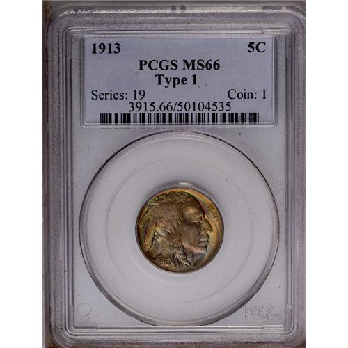 <B>1913<5C> Type One MS66 PCGS.</B></I> Reddish-gold, bronze, and aqua toning covers both sides of this highly lustrous piece. A sharply struck example of this short-lived variety that would fit well in a type set.
