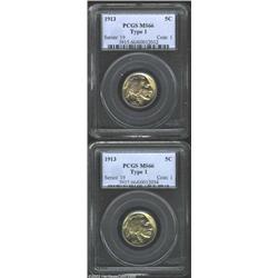 1913 5C Type One MS66 PCGS, two examples, the first coin has gold and powder-blue patina and a bold strike, while the second coin is lightly toned with a good strike. Both Gems are lustrous and immaculately preserved. 2 coins Important notice: We expect to be auctioning lots at the rate of 200-250 per hour. Sometimes eBay Premier live bid software cannot keep up with that pace, so we strongly recommend that you place a realistic proxy bid now as insurance to avoid disappointment. Also please note that all Heritage/CAA lots purchased through eBay Premier carry a 20% Buyer's Premium. Please make sure you read the Terms and Conditions.