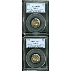 <B>1913 5C Type One MS66 PCGS,</B></I> two pieces, one of which displays even light champagne patina, the other revealing a more variegated golden-brown and champagne color pattern. 2 Coins Lot:5953